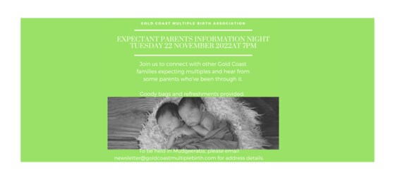 Join us for an information night for all parents who are currently expecting multiples.  Tuesday, 22nd Nov - 7pm Mudgeeraba Meet your future community of other expectant parents and hear from a few parents who have been through the journey.  This will be our last expectant parents night for 2022, so we hope you can make it! No question is a silly question..... we are all in this together  Event will be at Mudgeeraba, please RSVP to newsletter@goldcoastmultiplebirth.com to receive address details and so we can ensure we have enough goodie bags and refreshments to go around.