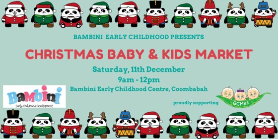 Mountains of outgrown clothes, toys, books, and baby equipment? Book a space at the Bambini Christmas Kids & Baby Market and sell it all! Saturday, 11th December - 9.00am-12.00pm Bambini Early Childhood Centre   Bambini Early Childhood Centre is holding a Christmas Baby & Kids Market where you can sell all your unwanted pre-loved and new baby and kid's gear in one go.  Bambini Early Childhood is proud to support the Gold Coast Multiple Birth Association, with proceeds from stall hire to go to GCMBA. A stall space is approx 1.8m x 2m.  Each stall holder will be able to submit 4 large ticket items which will be sold in a dedicated 'large item' space, leaving you with more space for other items!  Stall holders will have access to the Centre from 8.00am on the day. The event will be open to the entire Gold Coast community to come and purchase the goods. Gold Coast Multiple Birth Assoc. members are welcome to purchase a stall space.   Don't have enough goods for a full spot?  Team up with a friend and share a stall! Enquiries to events@goldcoastmultiplebirth.com Booking fees are non-refundable and non-transferable