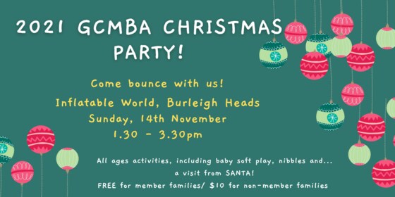 Come bounce into the holiday season at the 2021 GCMBA Christmas Party at Inflatable World, Burleigh! There are areas suitable for all ages, including a baby soft play area, nibbles and Santa will be visting too!! Please bring a wrapped and labeled book for your children to be given out by Santa. And don't forget your socks! Tickets are FREE for GCMBA financial member families and $10 per family for non-members.  Register your attendance below for numbers. We look forward to seeing you there!   If you would like to become a member :https://gcmba.tidyhq.com/public/membership_levels/27f254de77cf   Tickets and non refundable and non transferable