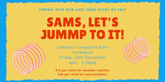 Come jump with GCMBA for the last SAMs event for 2021! Spring out of the school year with a 2.5 hour session at  Jummps Trampoline Park, Parkwood Friday, 10th December - 4 - 6.30pm $15 per child for member families/ $20 per child for non-members Tickets are non transferable and non refundable